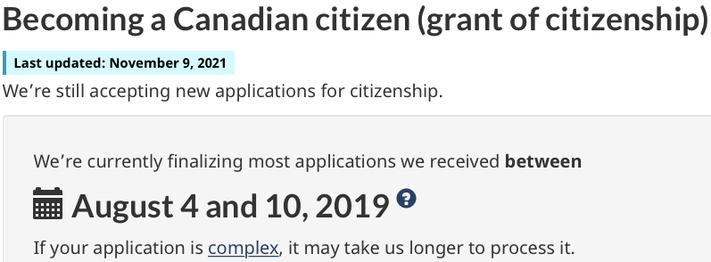 As of November 9, 2021, Immigration, Refugees and Citizenship Canada (IRCC) was finalizing most applications of grants of citizenship, received between August 4 and 10, 2019, per IRCC (shown below). It may mean that the processing time could stand at about 26 months.
