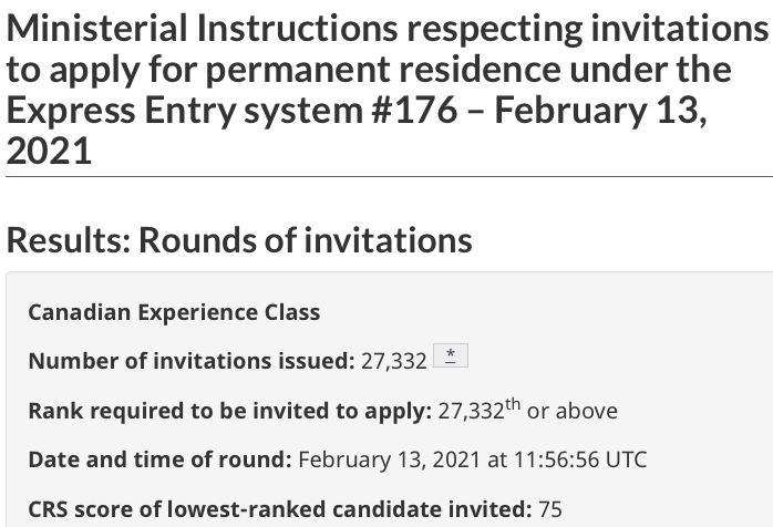 On February 13, 2021, Immigration, Refugees and Citizenship Canada (IRCC) invited 27,332 candidates for Canadian permanent residence. The round of invitations was exclusive to the Canadian Experience Class category in the Express Entry system.