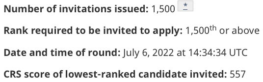 On July 6, 2022, Immigration, Refugees and Citizenship Canada (IRCC) issued 1,500 invitations to apply for Canadian permanent residence under the Express Entry system. The cut-off Comprehensive Ranking System score was 557.