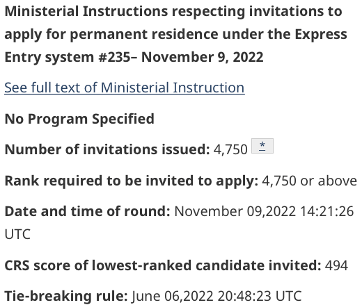 On November 9, 2022, Immigration, Refugees and Citizenship Canada (IRCC) issued 4,750 invitations to apply for Canadian permanent residence under the Express Entry system. The cut-off Comprehensive Ranking System score was 494.