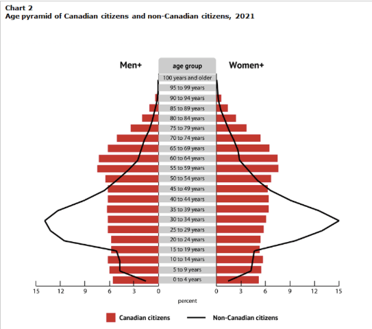 - Immigrants who were not Canadian citizens were younger than Canadian citizens on average.