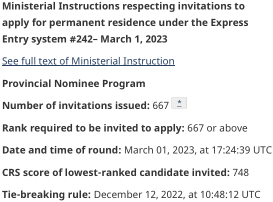 On March 1, 2023, Immigration, Refugees and Citizenship Canada (IRCC) issued 667 invitations to apply for Canadian permanent residence under the Express Entry system. The draw was only open for candidates in the Provincial Nominee Program and the cut-off Comprehensive Ranking System score was 748.