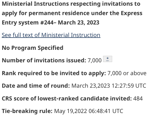 On March 23, 2023, Immigration, Refugees and Citizenship Canada (IRCC) issued 7,000 invitations to apply for Canadian permanent residence under the Express Entry system. The cut-off Comprehensive Ranking System score was 484.
