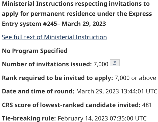 On March 29, 2023, Immigration, Refugees and Citizenship Canada (IRCC) issued 7,000 invitations to apply for Canadian permanent residence under the Express Entry system. The cut-off Comprehensive Ranking System score was 481.