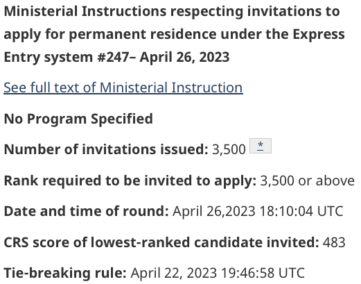 On April 26, 2023, Immigration, Refugees and Citizenship Canada (IRCC) issued 3,500 invitations to apply for Canadian permanent residence under the Express Entry system. The cut-off Comprehensive Ranking System score was 483.