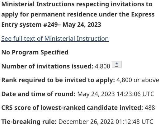 On May 24, 2023, Immigration, Refugees and Citizenship Canada (IRCC) issued 4,800 invitations to apply for Canadian permanent residence under the Express Entry system. The cut-off Comprehensive Ranking System score was 488.