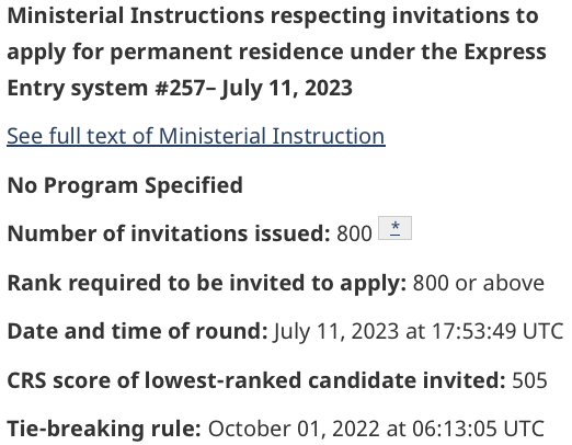 On July 11, 2023, Immigration, Refugees and Citizenship Canada (IRCC) issued 800 invitations to apply for Canadian permanent residence under the Express Entry system. The cut-off Comprehensive Ranking System score was 505.