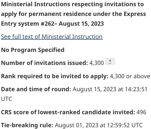 On August 15, 2023, Immigration, Refugees and Citizenship Canada (IRCC) issued 4,300 invitations to apply for Canadian permanent residence under the Express Entry system. The cut-off Comprehensive Ranking System score was 496.