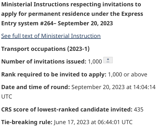 The draw was only open for candidates in transport occupations and the cut-off Comprehensive Ranking System score was 435.